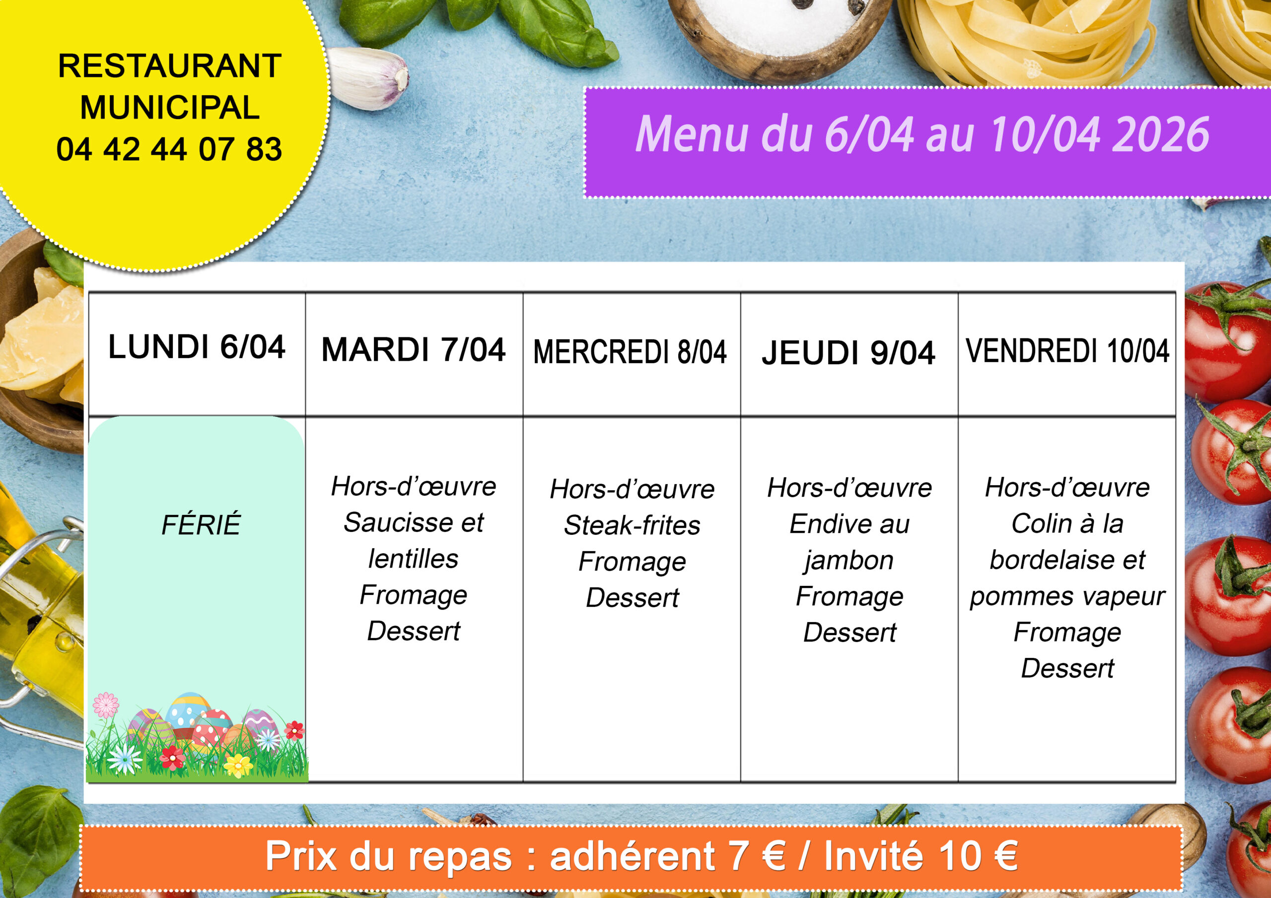 L’inscription aux repas se fait au restaurant au plus tard le mardi pour la semaine suivante.